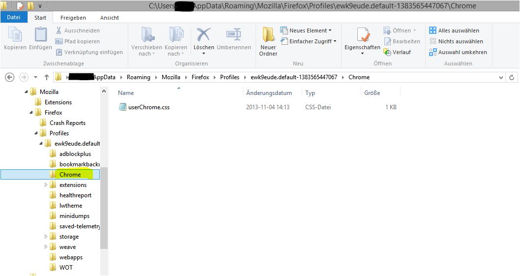 Danke noch mal für diesen Tipp. Der Ordner user.chrome.css hat bei dir 5 kb, bei mir 1kb; was ist da schief gelaufen?