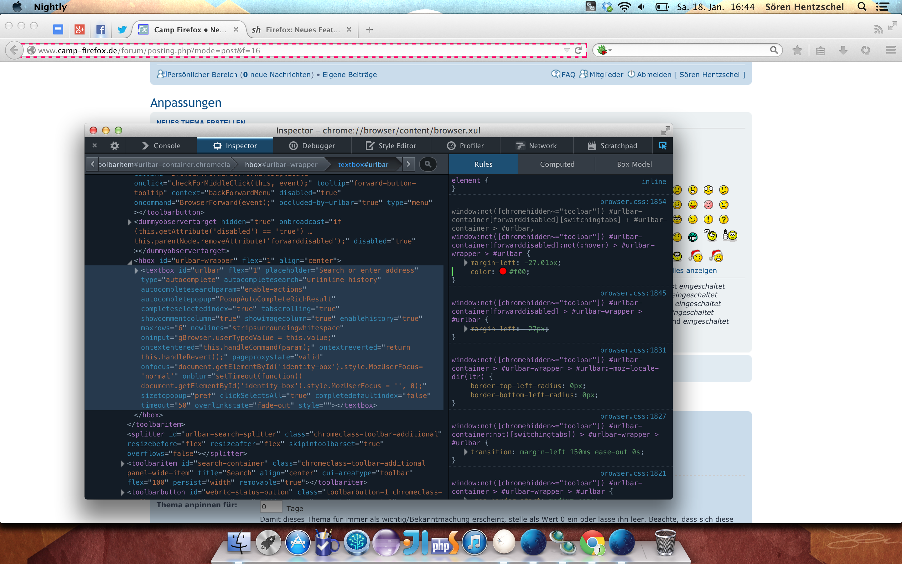 Ich wollte auf dieses Werkzeug noch einmal aufmerksam machen, weil es seit dem gestrigen Nightly endlich vernünftig benutzbar ist. Bislang musste man sich durch den DOM-Baum in der Markup-Ansicht kämpfen, nun kann man wirklich wie auf Webseiten das Inspector-Icon (ganz rechts in der Toolbox) wählen und dann einfach die Maus über die Oberfläche von Firefox führen und so Elemente auswählen.