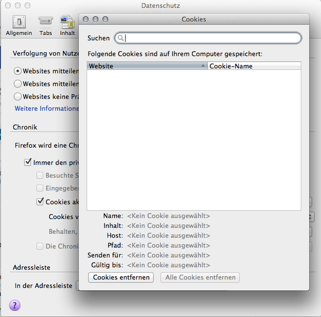 Wenn Cookies angelegt sind, wo sind diese außer über den FF zu finden?