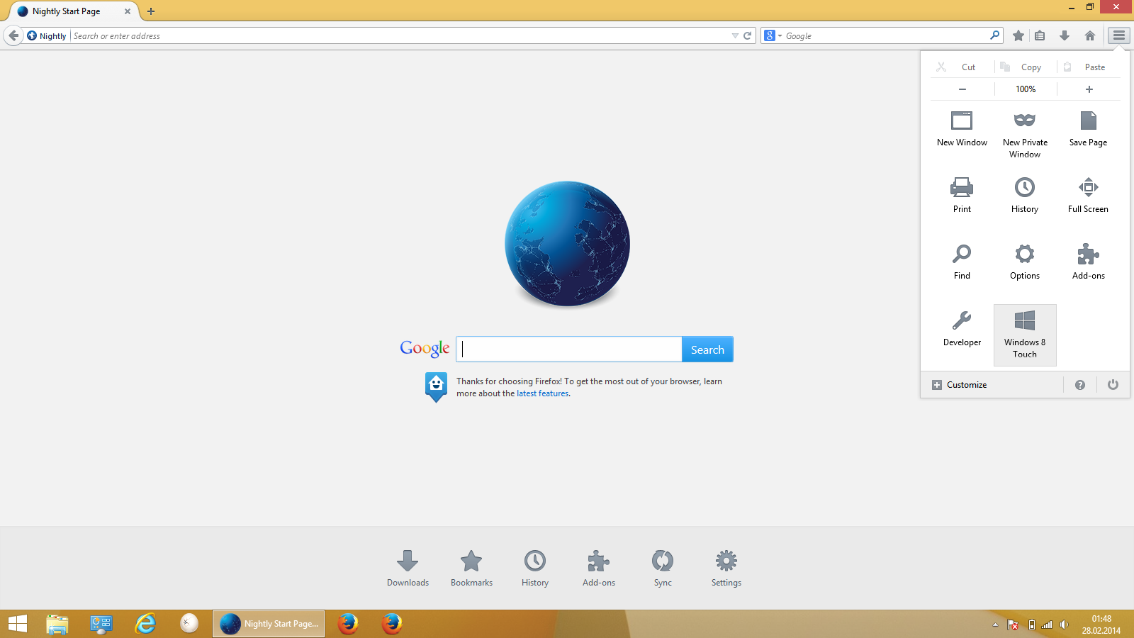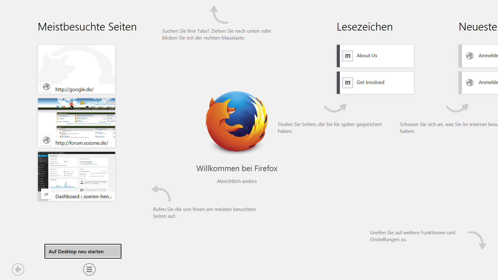 stelle sicher, dass du die aktuellste Beta-Version von Firefox 28 besitzt und wähle dann aus dem Menü den Eintrag "Als Firefox für Windows 8 Touch neu starten".