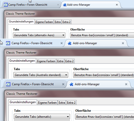 Nachdem Mozilla unter Win8(.1) die eigentlich blaue "Aero"-Oberfläche durch die graue ersetzt hat, macht es keinen Sinn mehr die gerundeten 'Aero' Tabs zu verwenden, da diese Bilder mit festen Farben sind, die für die blaue Oberfläche im Rahmen eines Experiments erstellt wurden.