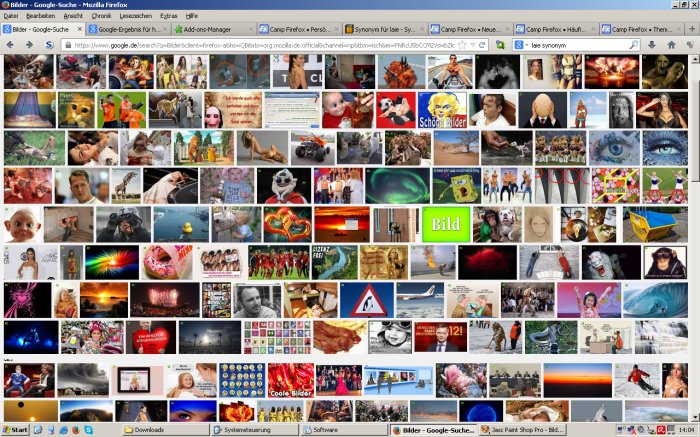 Wenn ich den Adblock Plus aktiviert lasse und stattdessen über NoScript Goggle.de verbiete, dann werden paradoxerweise auch alle Bilder wieder angezeigt, nur in einer anderen Ansicht, d.h. mit Angabe der jeweiligen Website darunter. Und dann kann ich sie auch durch einfaches Anklicken mit der Maus öffnen (was jedoch nicht geht, wenn ich "Google.de" erlaube.)
