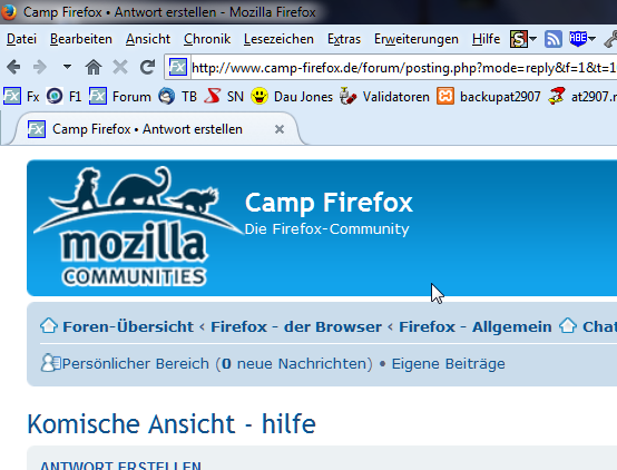 Nein, bei deinem Gewurschtel wie neulich bist du der einzige, der wissen kann und sollte, was du da verbockt hast. Sei einfach wie alle anderen 99% aller Benutzer und nutze Firefox wie er kommt, dann hast du auch keine Probleme. Derzeit sind deine Anfragen aus meiner Sicht schlichtweg unpassend, weil die Zeit für eine ausführliche Analyse nicht vorhanden ist - andere haben auch Probleme, die vor allem nicht auf Eigenmurks beruhen.