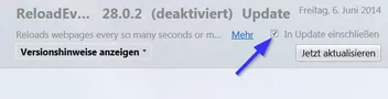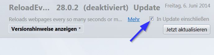 folgende Situation: Ich habe eine spezielle Version eines Addons (ReloadEvery), das ich von updates ausschließen möchte, da die updates eine besondere Funktion wieder außer Kraft setzen. Nun besteht ja die Möglichkeit, eine manuelle Suche nach updates durchzuführen. Mir werden dann entsprechend alle verfügbaren updates angezeigt. Darunter jedoch auch "ReloadEvery". Es besteht nun zwar die Möglichkeit das Häkchen bei "in updates einschließen" zu entfernen und somit das update zu verhindern; das funktioniert auch, nur meine Vorstellung ist es, dass ich die Auflistung von ReloadEvery komplett verhindere, so dass es mir erspart bleibt, bei jeweiligen updates das Häkchen jedesmal entfernen zu müssen :wink: