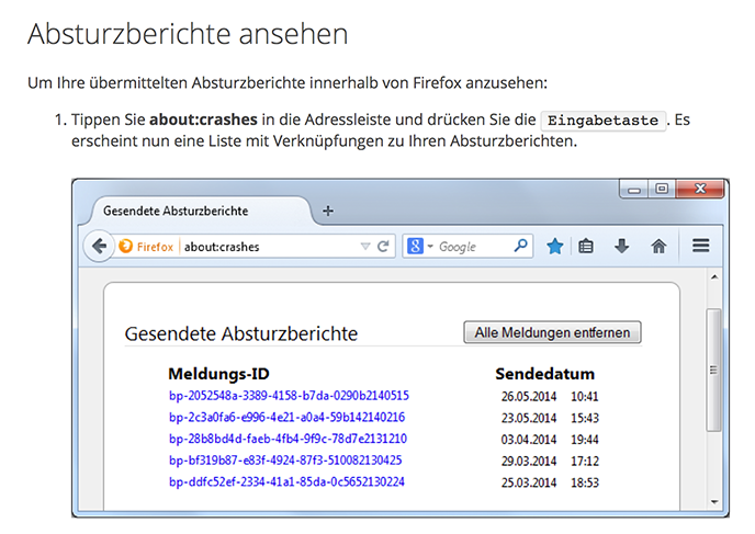 Wenn ich about:crashes eingebe, lese ich: