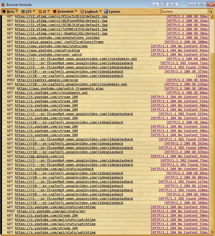 In der Leiste oben befinden sich fünf Buttons, mit denen man das Anzeigen diverser Meldungen ein- und ausschalten kann. Aktiviere die Netz-Meldungen, dann siehst du, was alles geladen wird. Die anderen Meldungen sollen besser deaktiviert sein, sonst wird es zu unübersichtlich.