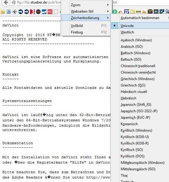 unter Ansicht/Zeichencodierung ist Unicode angehakt. Nun aktiviere ich Westlich, schließe FF, öffne wieder und Unicode ist wieder aktiviert.