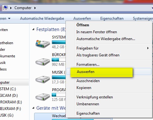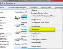 Sie können Geräte auch im Ordner "Computer" sicher entfernen. Klicken Sie auf die Schaltfläche "Start", klicken Sie auf Computer, klicken Sie mit der rechten Maustaste auf das Gerät, das entfernt werden soll, und klicken Sie dann auf Auswerfen.