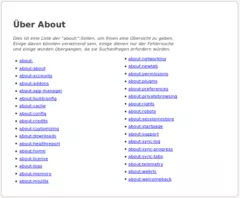 wenn ich in der Suche about:about eingebe, dann werden keine Ergebnisse gefunden. Kann es wirklich sein, dass bisher niemand diese Seite schöner gestaltet (angepasst) hat? Denn das wäre mein Wunsch.