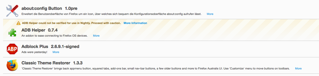 Nachtrag, wo ich meinen Screenshot gerade sehe: Das entspricht schon mehr dem, wie das dann mit nicht signierten Add-ons in einer finalen Version von Firefox aussehen wird: