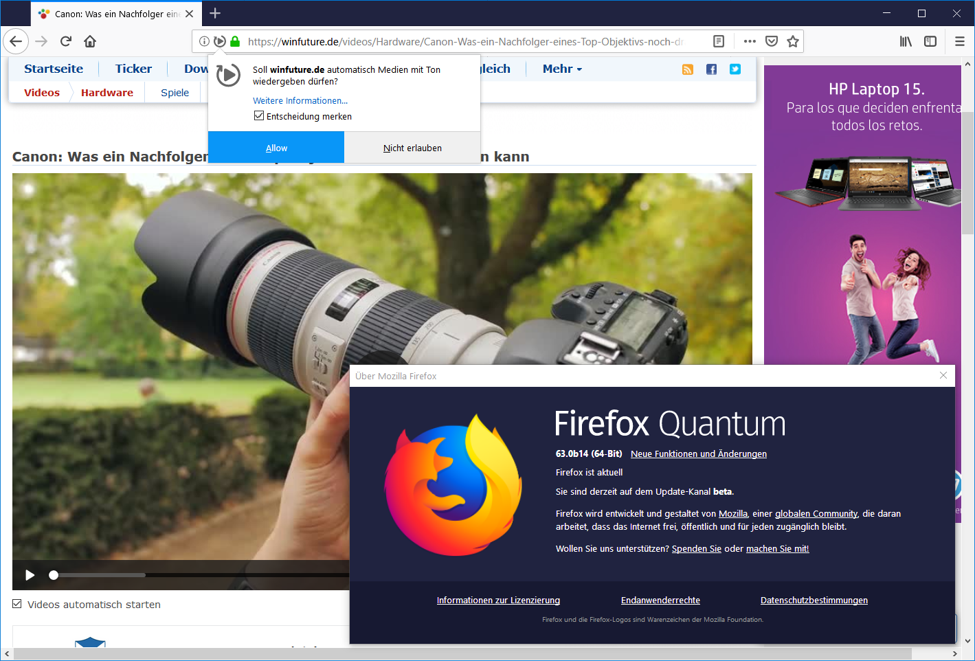 • Ich nutze eine Nightly-Version von Firefox. Der in Firefox integrierte Autoplay-Blocker verhindert das Abspielen ohne Erweiterung und ohne, dass ich etwas einstellen muss. Das Feature wird ab Firefox 64 standardmäßig aktiviert sein, kann sicher auch schon in Firefox 63 aktiviert werden. Bezüglich Firefox 62 bin ich mir gerade nicht sicher.