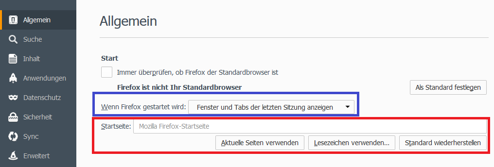 Nun, Firefox startet immer mit der letzten Sitzung, und dass obwohl ich möchte dass er mit der Firefox Startseite starten soll und dies auch so eingestellt ist