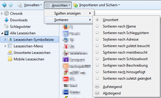 Hallo, seit kurzem sortiert sich meine Symbolleiste immer von selbst wieder um. Beispiel: Ich habe eine bestimmte Reihenfolge in der Symbolleiste und verschiebe "Wohnblogs" in die seitliche Fortführung der Symbolleiste. Beim nächsten Start ist der Tab "Wohnblogs" wieder ganz vorne links oben in der Symbolleiste. Und so geht es auch mit einigen anderen Lesezeichen in der Symbolleiste. Wie kann man es ändern, dass die einmal festgesetzen Lesezeichen an ihrem Platz bleiben?