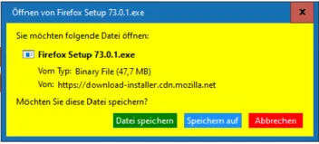 CSS Alles anzeigen/***************************************************************************************************/ /*************** Download-Fenster ** Datei speichern und öffnen mit **** einfärben *****************/ @-moz-document url(chrome://mozapps/content/downloads/unknownContentType.xhtml) { #openHandler{ -moz-appearance: none!important; min-height:20px!important; background:lightgreen!important; } dialog#unknownContentType{ background:yellow!important; } .dialog-button[label="Abbrechen"]{ -moz-appearance: none!important; color:white!important; background:red!important; } .dialog-button[label="Speichern auf"]{ -moz-appearance: none!important; color:white!important; background:dodgerblue!important; } .dialog-button[label="Datei speichern"], .dialog-button[label="OK"]{ -moz-appearance: none!important; color:white!important; background:green!important; } }Sieht dann so aus: