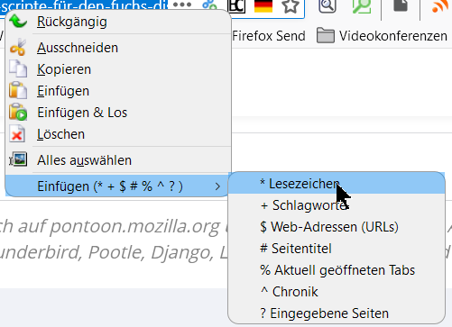 Ich habe es zwar soweit hingekriegt, dass das Untermenü im Kontextmenü der URL-Leiste wieder angezeigt wird, aber das Einfügen der Zeichen beim Klicken auf einen Eintrag im Untermenü funktioniert nicht.