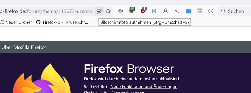 • Ich habe hier das Symbol Bildschirmfoto im Anpassen-Fenster von Fx 92. Der Pfad in Zeile 26 bezieht sich auf den Ort des Standardsymbols von Firefox. Deshalb erscheint das Symbol wohl auch nur einmal.