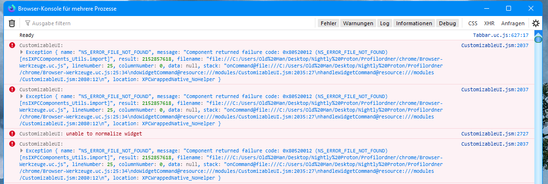 • Ach, du hast recht, es gibt eine Variable enableRestart. Die hatte ich auf 0 gelassen. Ich brauche diesen Eintrag im Skript nicht, ich habe das Symbol vom RestartFirefoxButton-Skript sichtbar in der Symbolleiste.