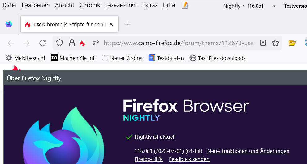 Ich habe jetzt einfach mal https://raw.githubusercontent.com/Endor8/userChr…LiteforFx.uc.js über die Konsole ausgeführt und das funktioniert in Firefox 116 Nightly.