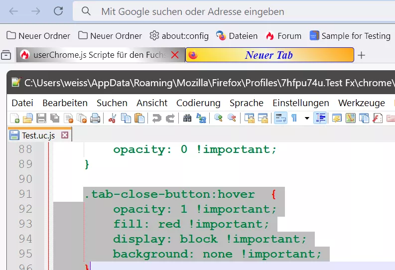 Das ist so, Andreas. Inder userChrome.css gibt es damit ja auch keine Probleme. Da wird dann bei hover auch das Kreuz mit color: red in dieser Farbe gezeigt. Aber nicht im Script, und das kann ich immer noch nicht verstehen.
