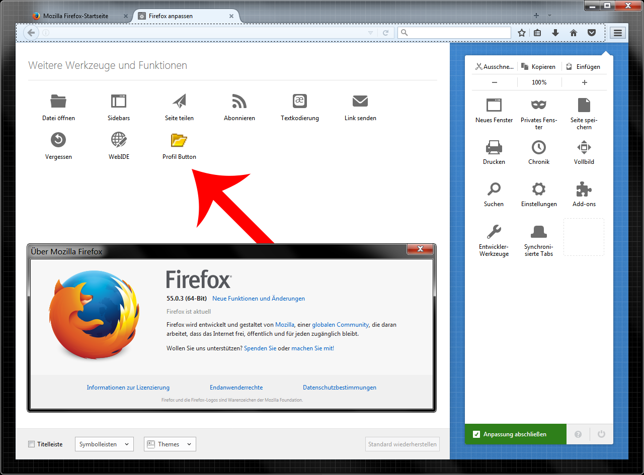 Hast du auch mal im Anpassenfenster nachgesehen ob sich da jetzt evtl. ein Button: Profilordner befindet?