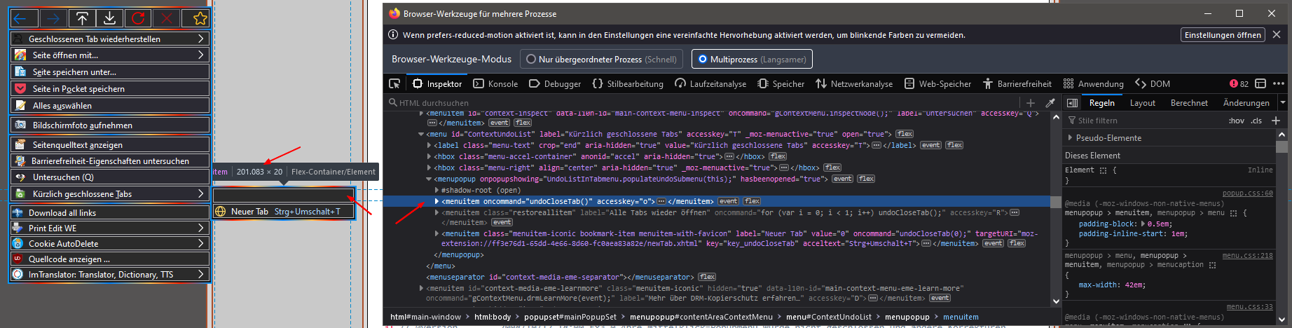 • Upps, eben stand noch ein CSS-Code dabei, allerdings klappt es sowohl mit als auch ohne nicht, der Abstand bleibt groß... der Eintrag "Geschlossenen Tab wieder öffnen" ist verschwunden, der andere "Alle Tabs wieder öffnen" aber noch vorhanden.