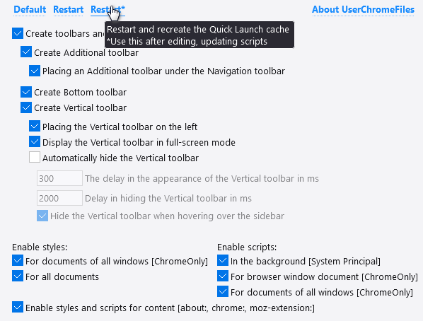 • Skript-Loader im User_Chrome_Files (UCF) Konzept. Standardmäßig erstellt optional vertikale, obere und untere toolbar, Flexible Space, Space, Separator. Aufrufen der about:user-chrome-files