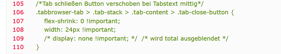 In diesem Script RE: MultiRowTabsLiteforFx – Fehlersuche und Kompaktierung ist ja schon der Close-Button eingearbeitet, deshalb habe ich den css-Code dazu entfernt, und den Script-Code dahingehend verändert, dass es meinem Wunsch entsprechend angezeigt wird, ausgewählt das Format 3.