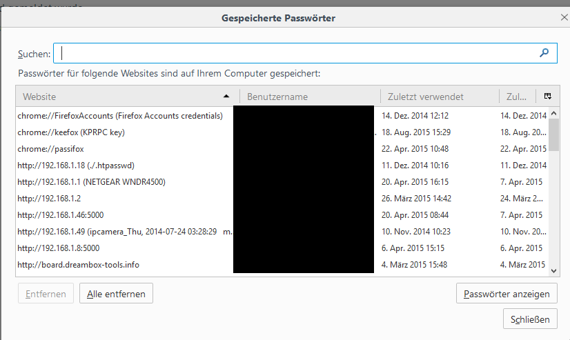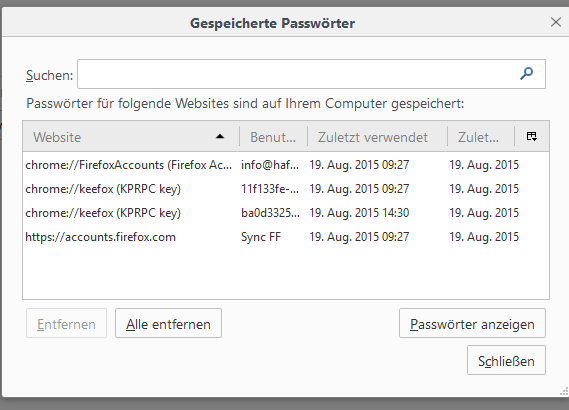 Obwohl die Passwörter im KeePass 2 gespeichert werden, finde ich auf einmal die ganzen Passwörter auch unter FF-Einstellungen --> Sicherheit --> Passwörter --> gespeicherte Passwörter.