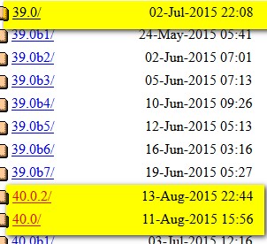 Mhhh, das ist sehr merkwürdig. Irgendwie kann die Seite nicht stimmen. Eine 39er-Version hatte ich gar nicht gehabt. Ich hatte gerade erst - über das automatische Update - auf die 38er (welche auch immer, aber ich bin mir ganz sicher das es die 38.0.8 war) geupdatet. Zwei, drei tage später kam die automatische Info 40.0 (auch die gibt es auf der Seite nicht. Die habe ich aber nicht gleich geupdatet und ein oder zwei Tage später kam die 40.0.2 - mit der habe ich dann noch ein paar Tage gewartet, bis ich sie installiert habe.