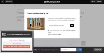 Frisches Profil--> ABP installiert (ohne irgendwas daran zu verändern)--> washingtonpost aufgerufen--> Artikel angeklickt--> Hinweis "To keep reading, please diesable your ad blocker" --> Auf das Schließen Kreuz geklickt--> Artikel lesbar