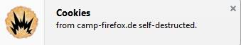 4. Ich warte mehr als 10 Sekunden ohne etwas auf der Seite ...camp-firefox.de... anzuklicken, dann drücke ich auf den Button "Cookies anzeigen...". Ich würde jetzt erwarten, dass nach diesen 10 Sekunden keine Cookies mehr zu finden sind. Allerdings finde ich dort jetzt noch 3 Cookies von camp-firefox.de.