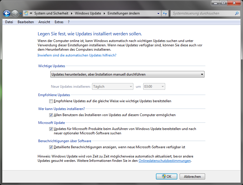 Heute ist es wieder passiert. Der Win 7 HP Rechner meines Mädels hat die Update Einstellung geändert