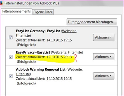 Ich nutze AdblockPlus und stelle immer wieder fest, dass eine Filterliste nicht regelmäßig ein Update macht.