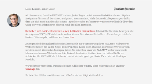 Weiß jemand, wie man die Aufforderung auf faz.net und bild.de den Adblocker Plus abzuschalten "bekämpfen" kann? Filter habe ich aktualisiert, aber klappt nicht. Mit NoScript das Java abzuschalten hat sicher mal vor wenigen Tagen funktioniert, aber da haben die Seitenbetreiber nun auch nen Riegel vorgeschoben. Jemand eine Idee?