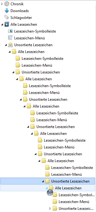Meine Lesezeichen liegen im Lesezeichen-Menü. Trotzedem finde ich meine ganzen Lesezeichen (Lesezeichen-Symbolleiste, Lesezeichen-Menü (mit meinen Lesezeichen) und meine Unsortierten-Lesezeichen) nochmals in den Unsortierten-Lesezeichen. Anscheinend in einer unendlichen Form.