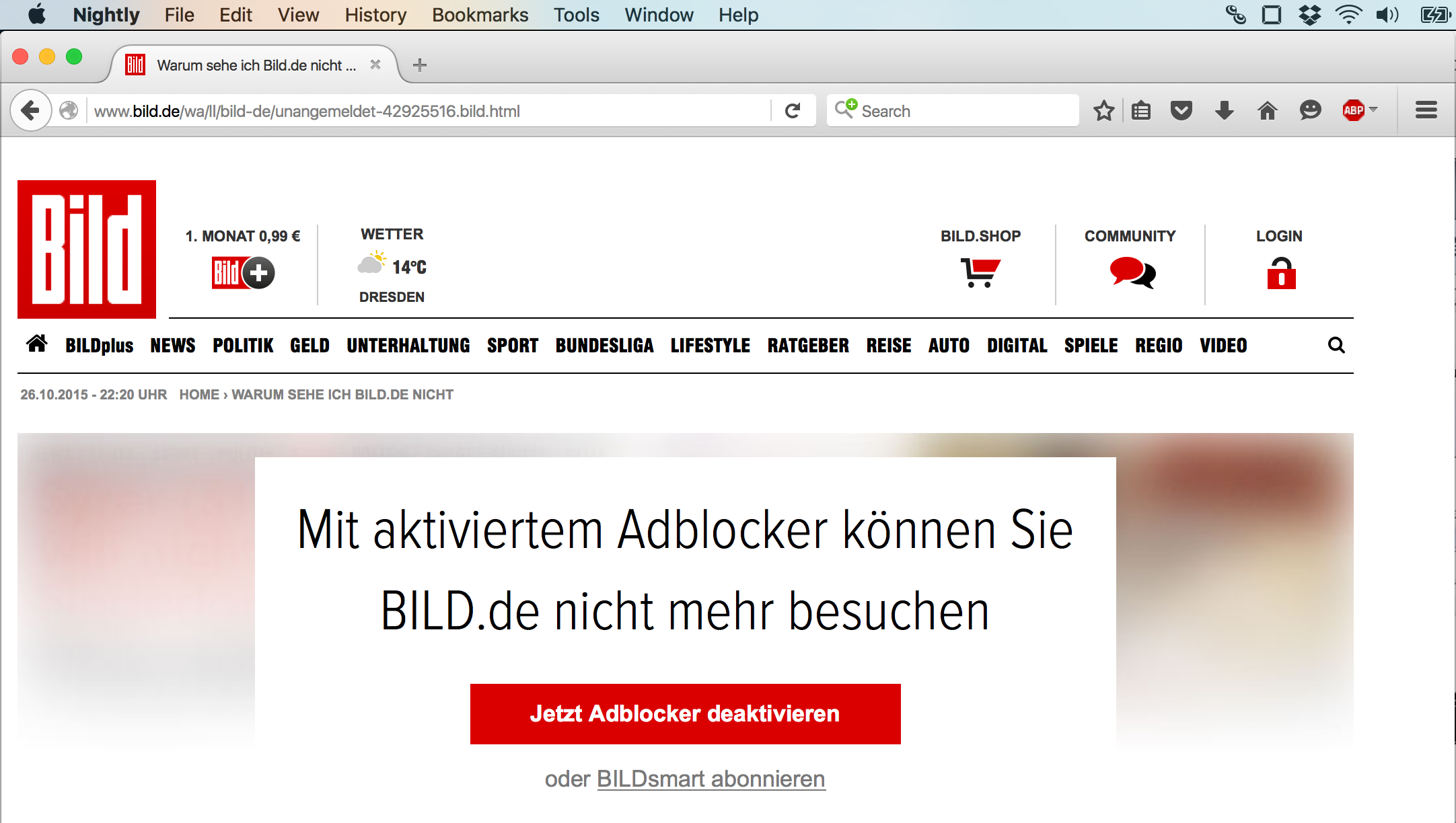 Beim Firefox greift die Sperre JavaScript-Sperre nur dann, wenn Anwender bei bild.de JavaScript erlauben. Wieso aber sollten sie das tun? Erlauben sie es dort nicht, funktioniert die Leseansicht weiterhin und blendet wirksamer und ressourcenschonender als ein Adblocker sowohl Werbung als auch die in <noscript> Tags eingebettete »Sperransicht« aus.