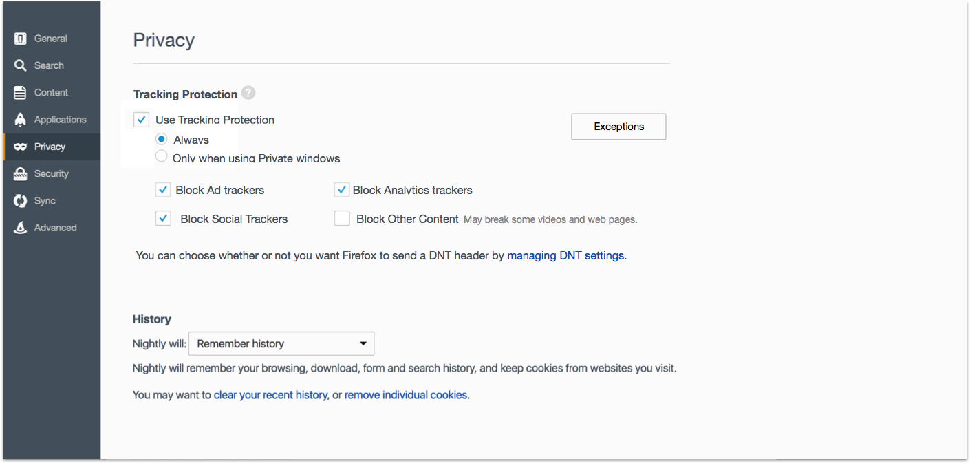 2. Firefox besitzt seit Version 42 einen eingebauten Tracking-Schutz für den privaten Modus. Der Tracking-Schutz soll natürlich noch besser in zukünftigen Versionen werden. Neue Mockups zeigen eine Unterscheidung zwischen "Social Trackers", "Ad Trackers" und "Analytics Trackers" (#1218891).