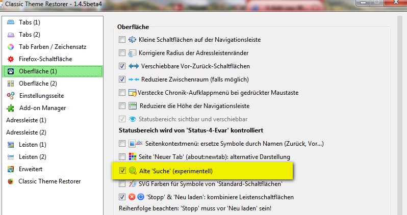 ich nutze mit Classic Theme Restorer das alte Suchfenster und dafür das Add-on Organise Search Engines. Es ist nicht signiert und wird nicht mehr gewartet (ist ganz aus AMO verschwunden).