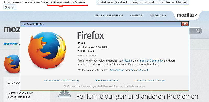 Ich nutze FF seit den Netscape-Tagen, immer in der neuesten Version, so ist es auch für die automatischen Updates eingestellt. Trotzdem erhalte ich auf diversen websites wie Web.de (Mailabfrage) und neuerdings auch auf Mozilla.org und hier im Forum die im Betreff und im Screenshot gezeigte Meldung.