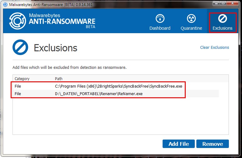 Im Malwarebytes gibt es die Funktion 'Ausschliessen'. Ich nehme an damit kann man Programme vom Scannen und löschen ausschliessen.http://www.heise.de/security/meldu…ty.beitrag.atom
