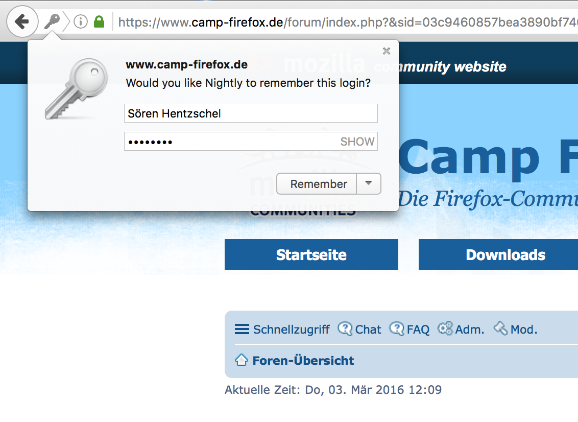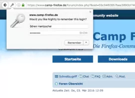 Über den Link https://www.camp-firefox.de/ neu aufgerufen, Benutzername mit Passwort neu eingegeben und "Dauerhaft anmelden" angehakt. Nach erfolgreichem Login die Daten im Passwortmanager neu speichern lassen.