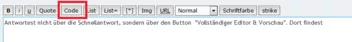 • Antwortest nicht über die Schnellantwort, sondern über den Button "Vollständiger Editor & Vorschau". Dort findest du dann den Button "code" .. Den Text dann zwischen diese beiden erschienen Klammern setzen : [ code ] hier zwischen den Text einfügen [ /code ]