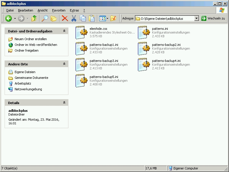 Folgendes, ich habe vor einiger Zeit von ABP auf uBlock umgestellt. Die Erweiterung wurde vorher deinstalliert, FF neu gestartet. Beim obligatorischen Sichern des kompletten Profils fiel mir dort gestern noch ein Ordner mit Namen "adblockplus" auf.