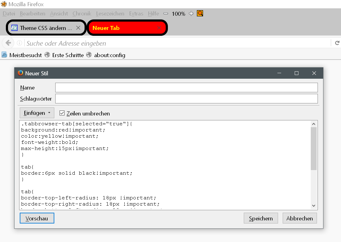 1. Dazu muß man sicher die CSS-Klassen (z.B. für Tabs) kennen, die Firefox verlangt? Gibt es da eine Übersicht oder wo finde ich die Datei mit der Standard-CSS?