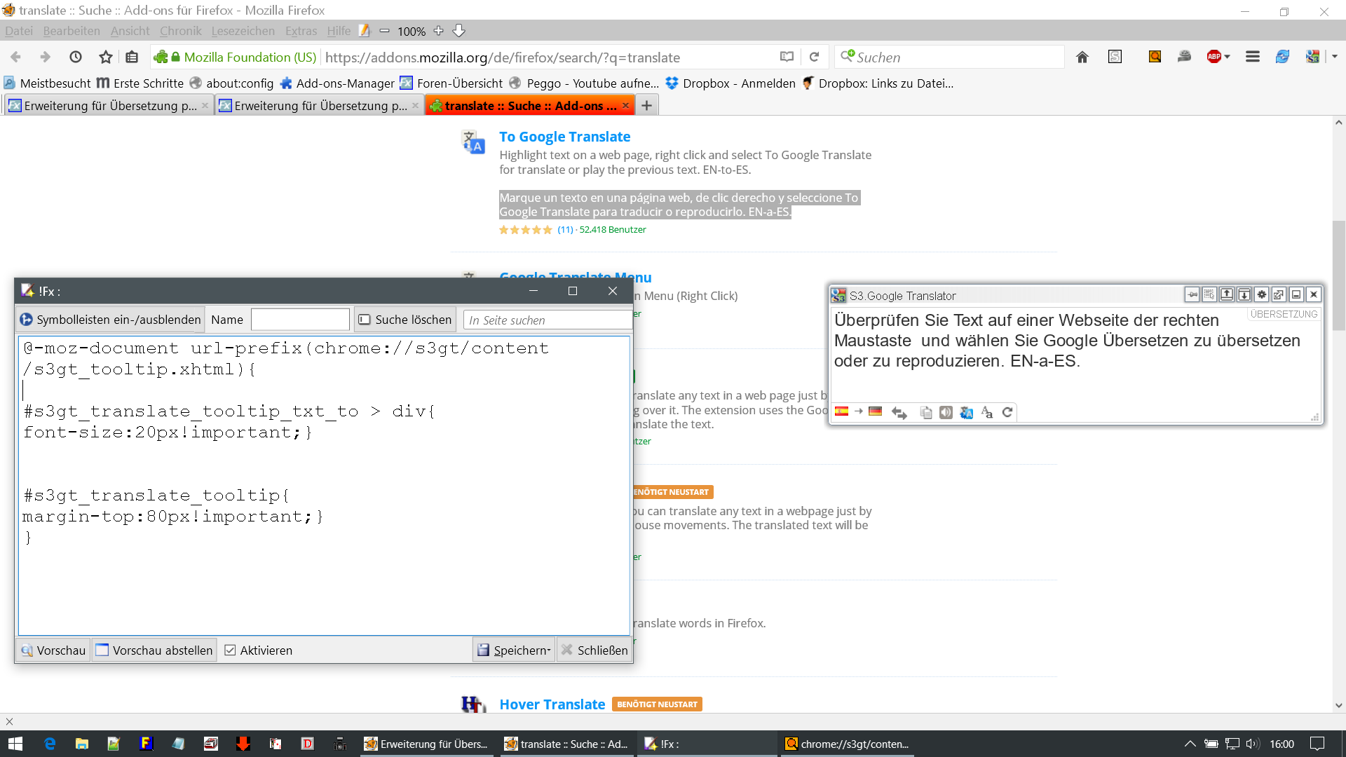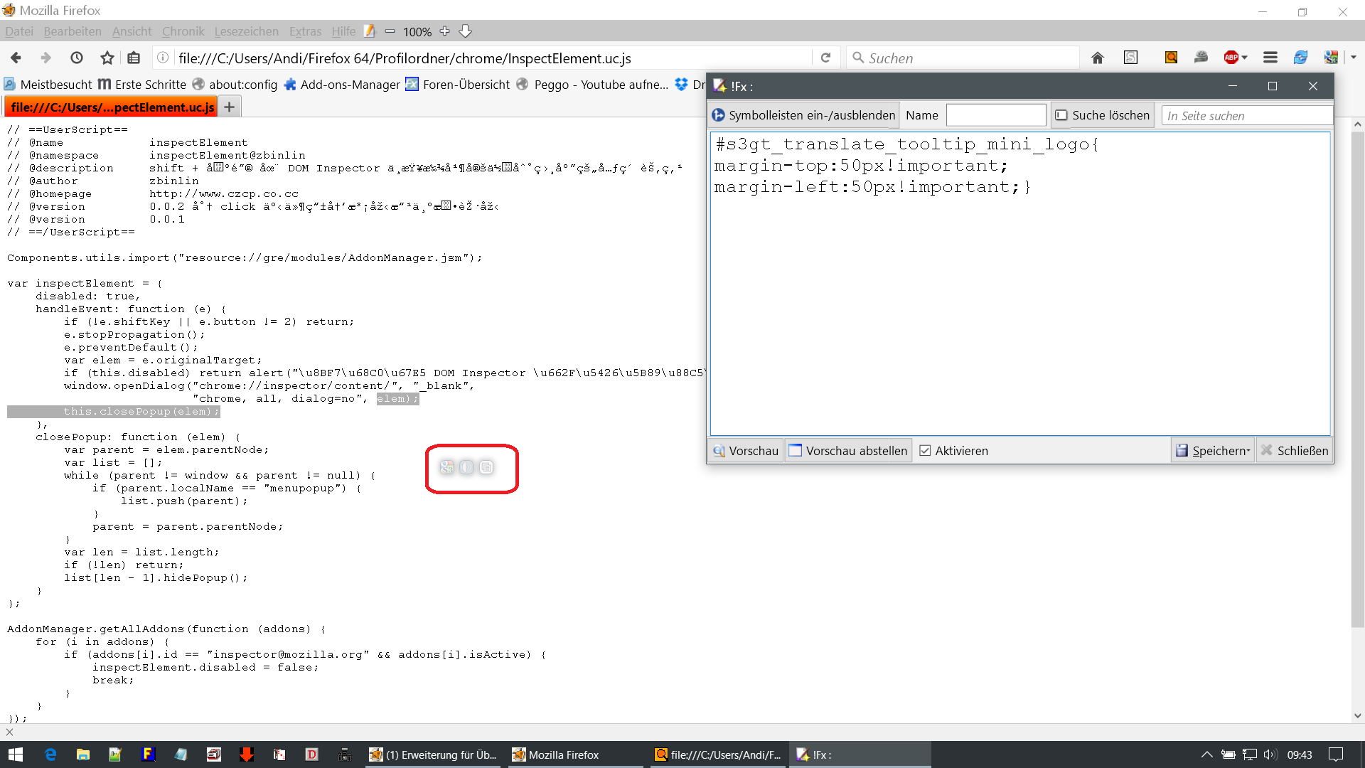 OK, das scheint jetzt zu funktionieren jedoch nur vertikal. Ginge es auch horizontal, d.h. weiter nach links bzw. weiter nach rechts verschieben? Überlegung ist, dass das Menü von "rechter Mausklick" sich ja im Grunde nur rechts der angeklickten Stelle öffnet und somit wäre es schlauer wenn die Icons vom Übersetzer im 45° links und oben von der angeklickten Stelle erscheinen. Damit halt wenn man nur was kopieren/markieren will das "rechte Maustaste-Menü" nicht die Icons überdeckt.