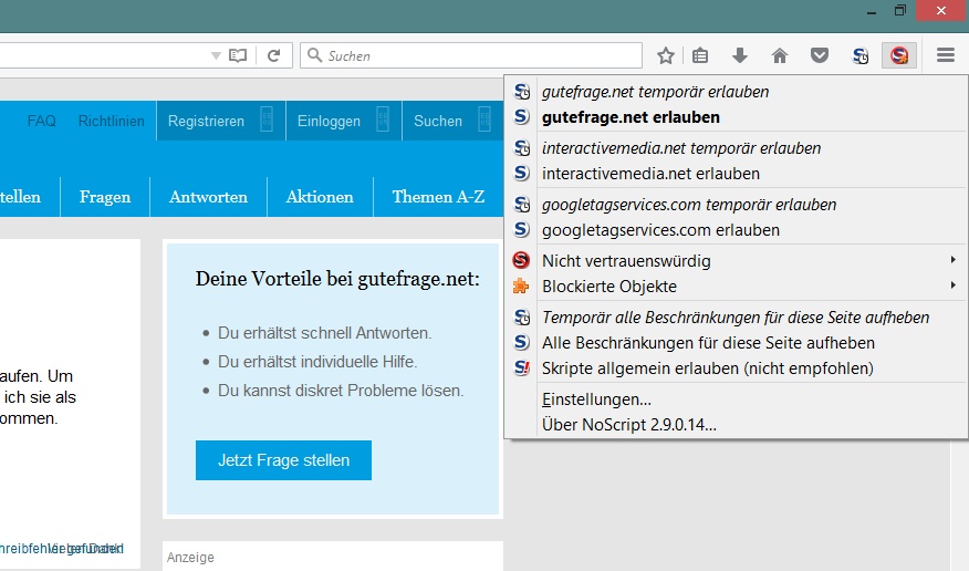 Leider ist es gerade bei solchen Seiten (oft Seiten von Onlinemedien oder Fernsehsendern) ziemlich unmöglich, die erforderlichen Scripte freizugeben, weil viele von denen in der Liste immer nur sehr kurz während des ladens der Seite auftauchen und sofort wieder verschwinden. So schnell kann man kaum lesen, von welcher Domain die kommen, geschweige denn, daß man sie per Click temporär erlauben könnte.