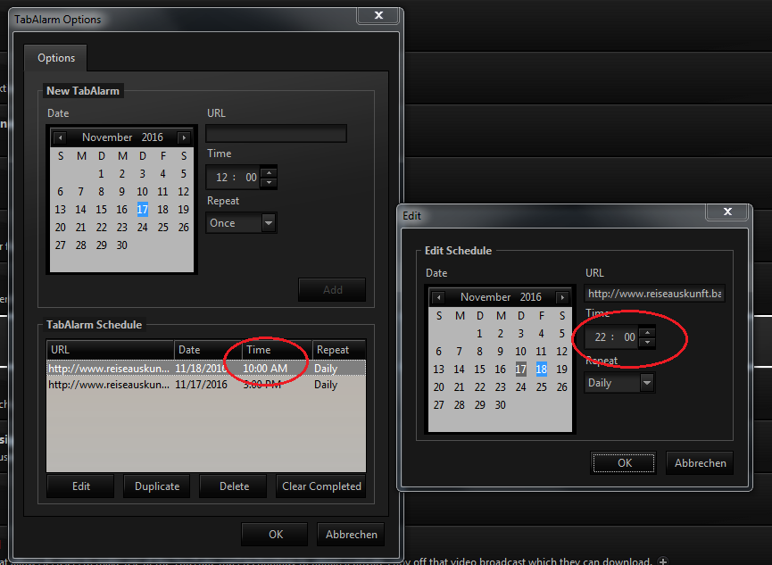 Ich werde mir My Weekly Browsing Schedule auch mal anschauen. Aber vom Prinzip reicht mir TabAlarm völlig aus für diesen einen Fall ;) EInmal eingerichtet muss man ja nicht weiter editieren ;)