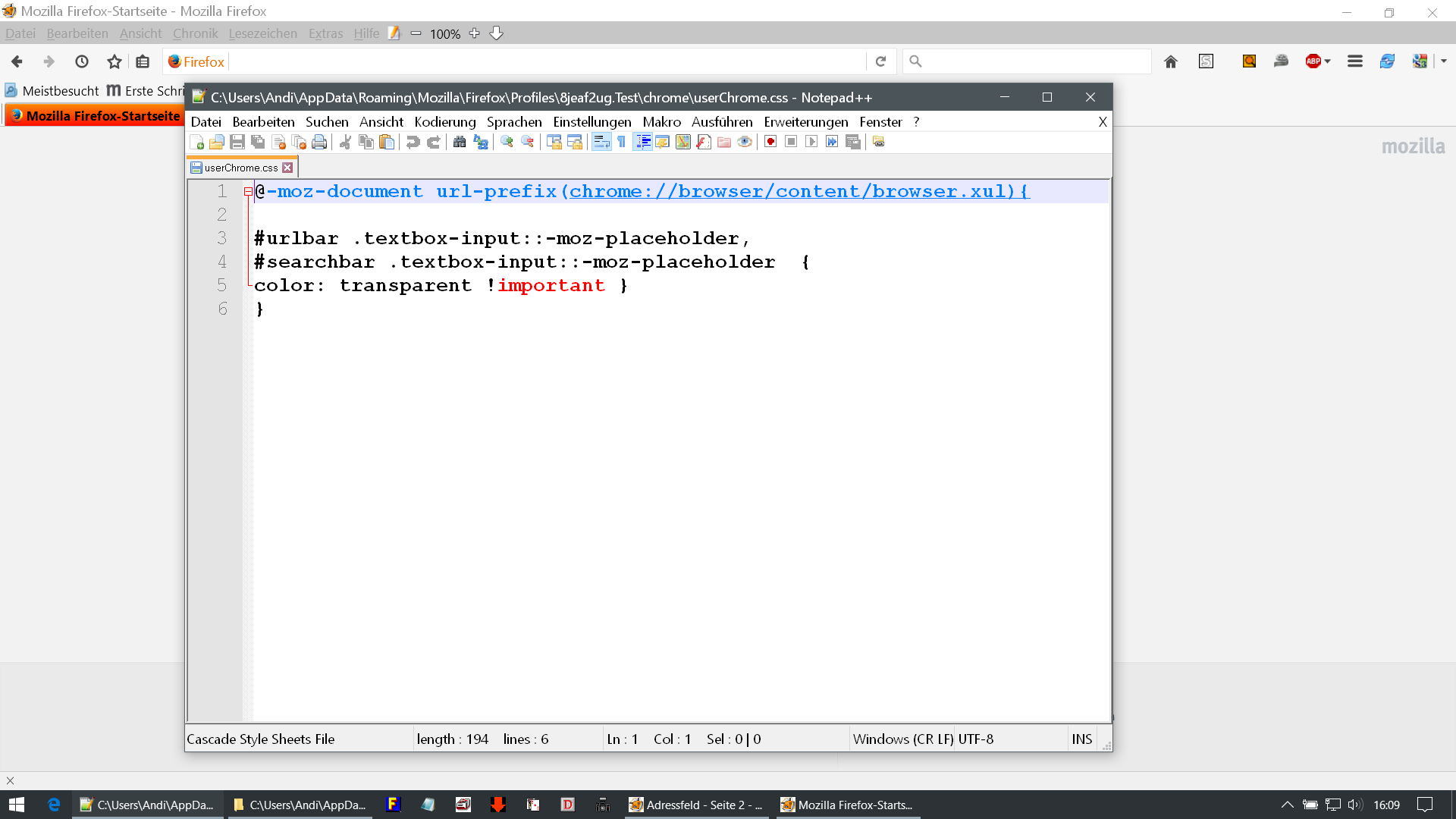 Daher habe ich das Script manuell ins userChrome.css kopiert.