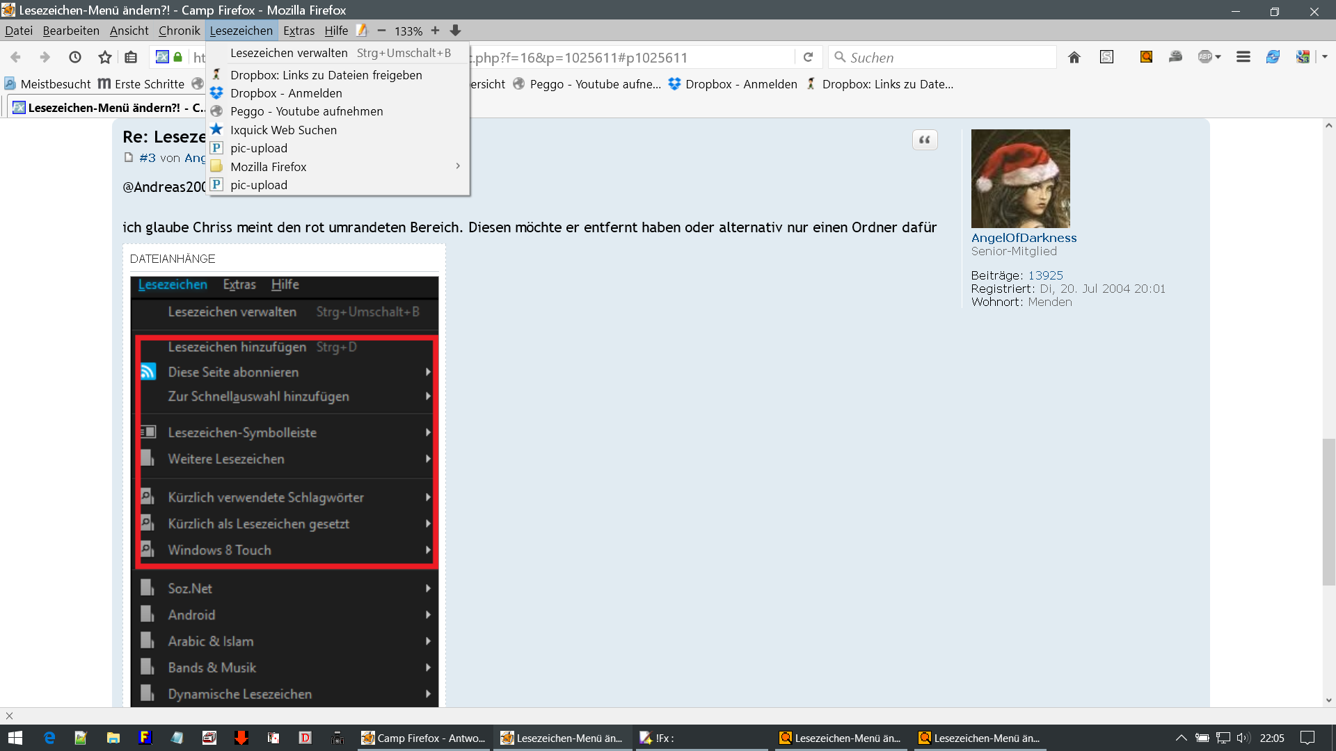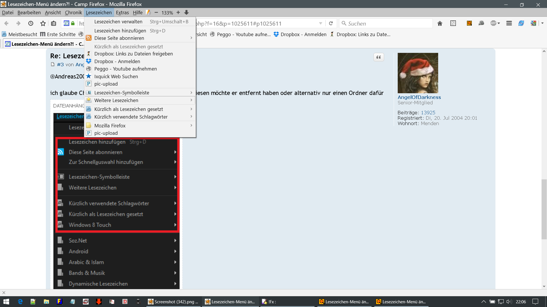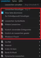Alles anzeigen@-moz-document url-prefix(chrome://browser/content/browser.xul){ menuitem[label="Kürzlich als Lesezeichen gesetzt"], #menu_bookmarkThisPage, menuitem[label="Lesezeichen für alle Tabs hinzufügen…"], menu[class="menu-iconic"][label="Diese Seite abonnieren"], menu[class="menu-iconic"][label="Diese Seite abonnieren…"], menu[class="menu-iconic"][label="Diese Seite abonnieren"][observes="multipleFeedsMenuState"], #subscribeToPageMenupopup, menu[label="Weitere Lesezeichen"], menu[class="menu-iconic bookmark-item"][label="Lesezeichen-Symbolleiste"], menu[container="true"][query="true"][class="menu-iconic bookmark-item"][label="Kürzlich als Lesezeichen gesetzt"], menu[container="true"][query="true"][class="menu-iconic bookmark-item"][label="Kürzlich verwendete Schlagwörter"], #bookmarksMenuPopup > menuseparator:nth-child(n+5){display:none!important;} }Mfg.