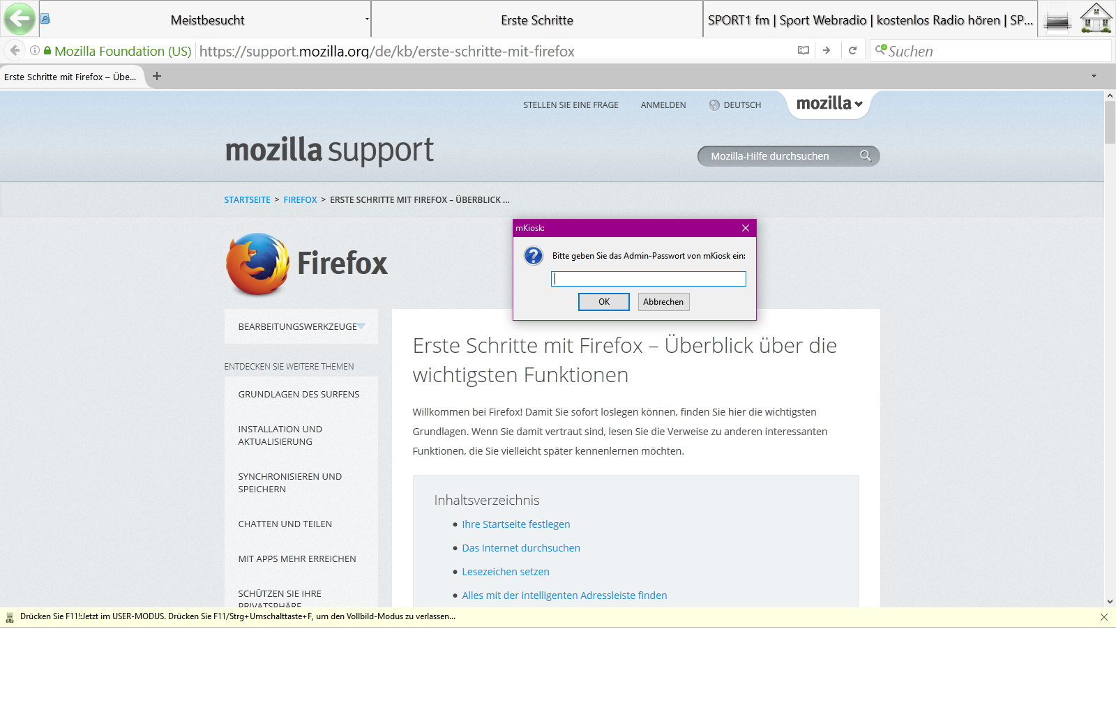 DIe Taste F1, F2 und F11 (Volbild) können per Admin-Kennwort für mKiosk gesperrt werden und damit der Vollbildmodus fest geseetzt werden. Ebenfalls können für den Kioksmodus diverse Rechte vergeben werden und ein klein wenig das aussehen angepasst werden.